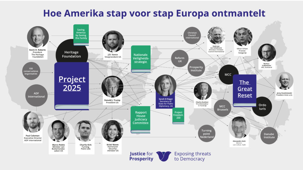 De toegenomen bemoeienis van Amerikanen in de EU is niet toevallig. In april 2023 publiceerde The Heritage Foundation Mandate for Leadership, een beleidsdocument van 900 pagina’s dat de blauwdruk vormde voor Trumps tweede termijn. Het werd bekend als Project 2025. Meer dan honderd ultra-conservatieve organisaties werkten eraan mee, van Alliance Defending Freedom tot het American Principles Project. Het document schrijft voor dat alle leidinggevenden op het State Department vervangen moeten worden door ideologisch gescreende loyalisten. Het pleit voor het afbouwen van buitenlandse hulp en het ‘herdefiniëren’ van allianties op basis van culturele en religieuze waarden.