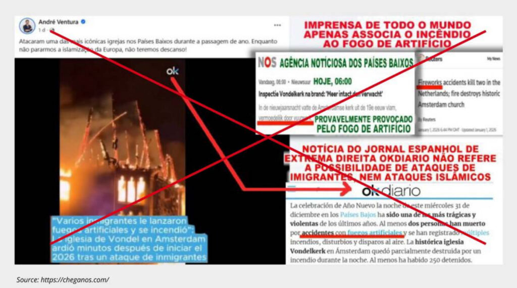Eén voorbeeld van hoe Ventura desinformatie verder aanwakkerde is de bekende Vondelkerkbrand. Op 1 januari deelde hij een video van de brand in de Amsterdamse Vondelkerk, met de titel “islamização da Europa”. Het resultaat? 1.028.534 views en 3.487 shares op social media als X en Instagram. De Vondelkerkbrand werd breed opgepikt door Europese extreemrechtse netwerken, influencers en pro-Kremlin media. De leugen dat de brand een aanval was op christelijk Europa verspreidde zich razendsnel. JfP deed hier uitgebreid onderzoek naar.