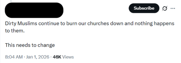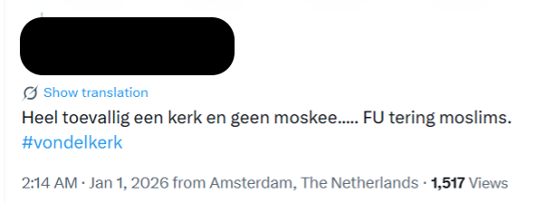 De analyse van Justice for Prosperity laat zien dat 20% van de posts op X op 1 of 2 januari een link legde tussen de Vondelkerkbrand en moslims. Van de top-10 posts met het meeste bereik, waren er 7 die migranten als zondebok aanwezen. Een korte verkenning van een aantal van die posts leert bovendien dat het complotdenken zich daarna bijzonder snel verspreidde, en zich vermengde met bredere theorieën over aanvallen op het Christelijke Europa en Christelijke symbolen.