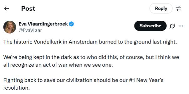 Om 2 uur ’s middags verscheen de rechts-radicale influencer Eva Vlaardingerbroek op X met een filmpje waar zij zelfs sprak over “oorlogshandelingen” door “jeugdbendes die in 99,9% van de gevallen uit moslims bestaan”. Dat de brand niet werd herkend als een oorlogshandeling, kwam uiteraard doordat de omwonenden allemaal ‘champagne-socialisten’ zijn die het niet wíllen zien. De post van Vlaardingerbroek was binnen één week 1,2 miljoen keer bekeken.