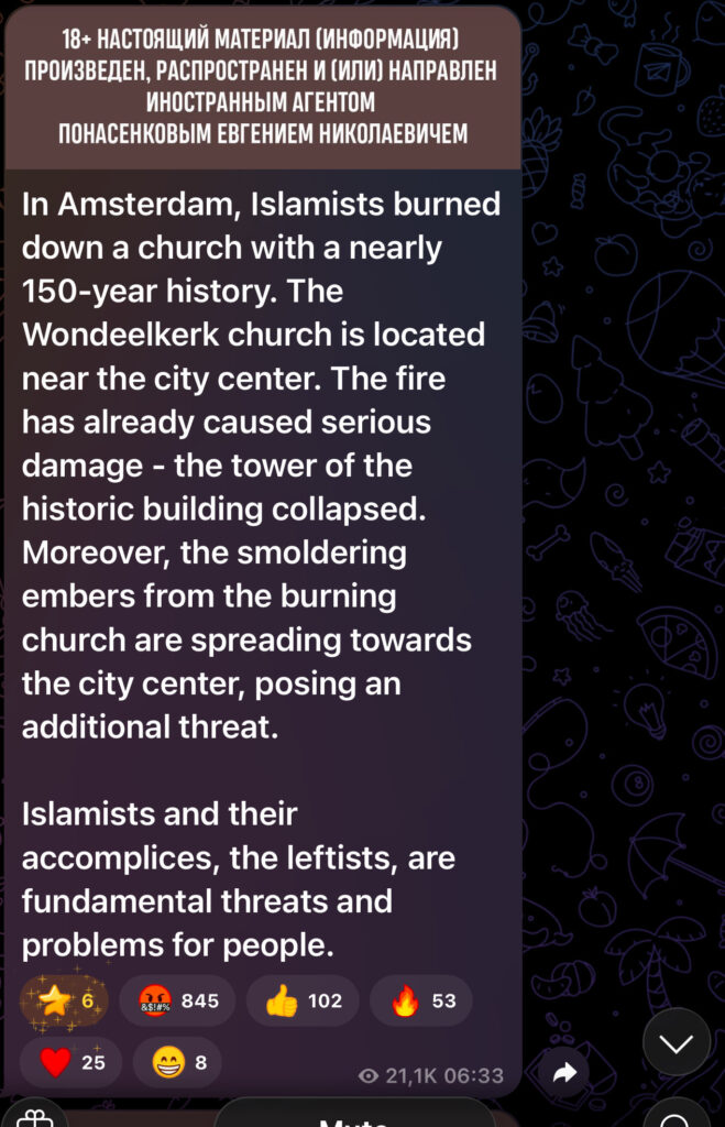 Net na 01.00uur zagen we online al een stroom aan valse claims, ook vanuit internationale hoek. NL influencers, Russisch gezinde en Engelstalige netwerken duidden de brand als een aanslag, zogenaamd gepleegd door “moslimnetwerken” die christelijk Europa in de as zouden willen leggen. Een aanslag.